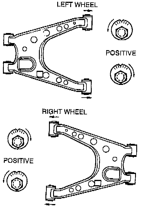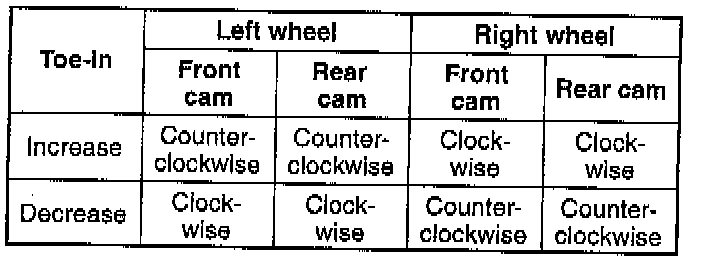 ^ Turning the front cam one graduation changes the toe-in about 2.8 mm (0.11 inch) and the camber about 15 minutes. Turning the rear cam one graduation changes the toe-in about 2.8 mm (0.11 inch) and the camber about 6 minutes.
