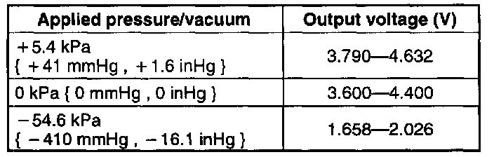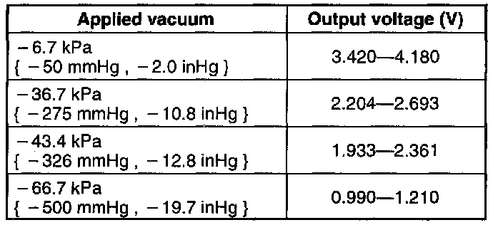 3. Increase the applied vacuum from - 6.7 kPa (-2.O in.Hg) to -66.7kPa (-19.7 in.Hg) and verify that the PCM terminal 3N voltage decreases accordingly.