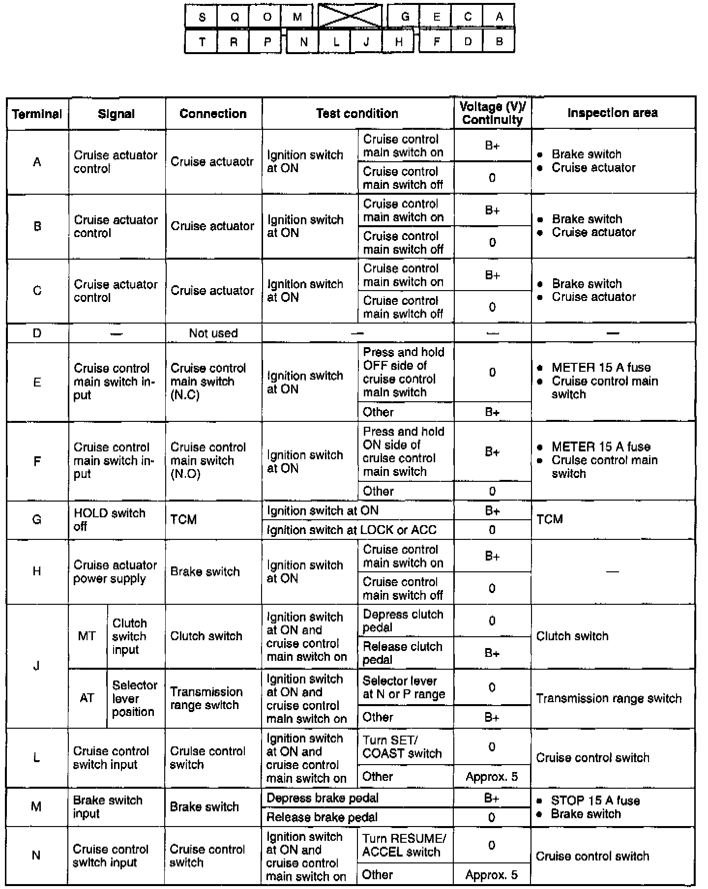 3. Measure the voltage at the cruise control module terminals as indicated below.