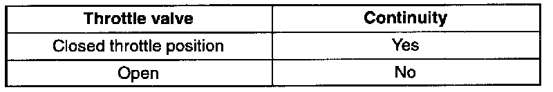 3. If not as specified, check the condition of the wiring harness of the closed throttle position switch. Replace the closed throttle position switch and the throttle body (as an assembly), if necessary.