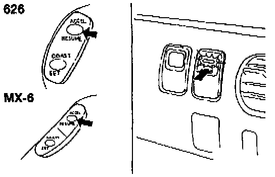 4. Press the RESUME/ACCEL switch and the cruise control main switch simultaneously to activate system inspection. (The cruise set indicator light will illuminate.)