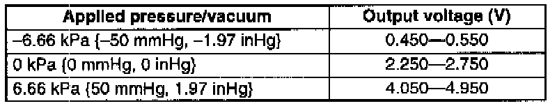 3. Decrease the applied pressure from +6.66 kPa (+50 mmHg, +1.97 in.Hg) to -6.66 kPa (-50 mmHg, -1.97 in.Hg) and verify that the PCM terminal 3F voltage decreases accordingly.