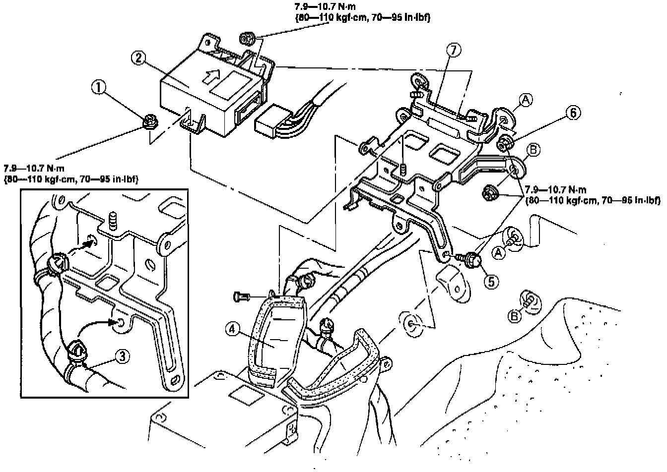 2. Position the SAS unit and bracket with the arrow on the SAS unit facing toward the front of vehicle. Install them and tighten the bolts and nuts to the specified torque.