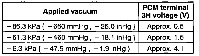 3. Increase the applied vacuum from -6.3 kPa (-1.9 in.Hg) to -86.3 kPa (-26.0 in.Hg) and verify that the PCM terminal 3H voltage decreases accordingly.