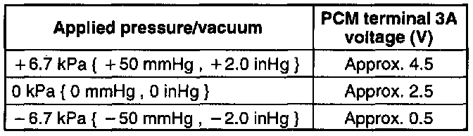 3. Decrease the applied pressure from 6.7 kPa (2.0 in.Hg) to -6.7 kPa (-2.0 in.Hg) and verify that the PCM terminal 3A voltage decreases accordingly.