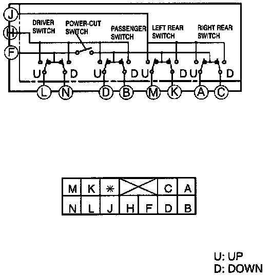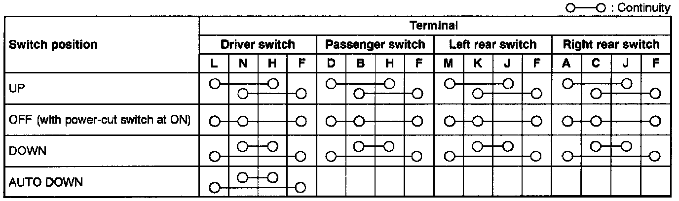 Check for continuity between the power window main switch terminals by using an ohmmeter.
