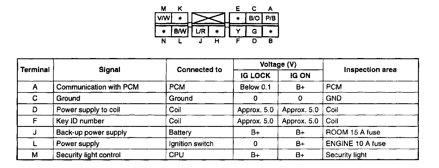 3. Measure the voltage at the immobilizer unit terminals as indicated.