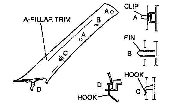 3. Pull the A-pillar trim upward to disengage hook C from the body.