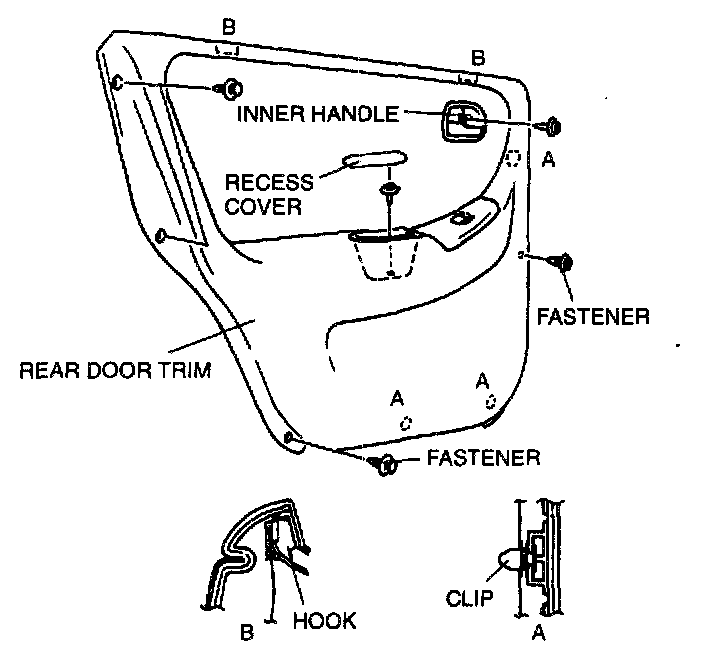 7. Pull the rear door trim upward to disengage hooks B from the body.