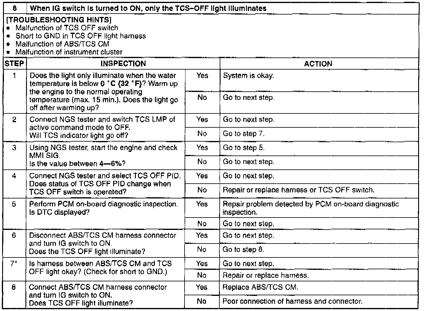^ The TCS OFF light illuminates at key on engine off. Start engine and inspect again. If any symptoms have occurred in the past but are now okay, malfunction of related harness could be the possible cause and thus ABS CM is normal.