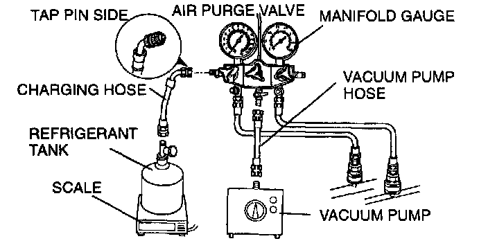 CAUTION: Close the manifold gauge valve immediately after stopping the vacuum pump. If the valve is left open, the vacuum pump oil will backflow into the refrigeration cycle and cause a decrease in the efficiency of the air conditioner.
