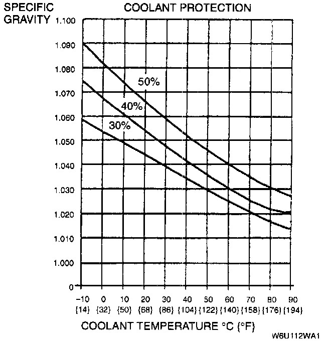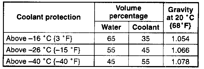 7. Referring to the following graph and chart, select proper gravity of the coolant. Slowly pour the coolant into the radiator up to the coolant filler port (FS) or into the engine up to the coolant filler port (KL).