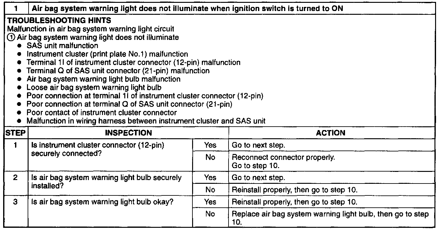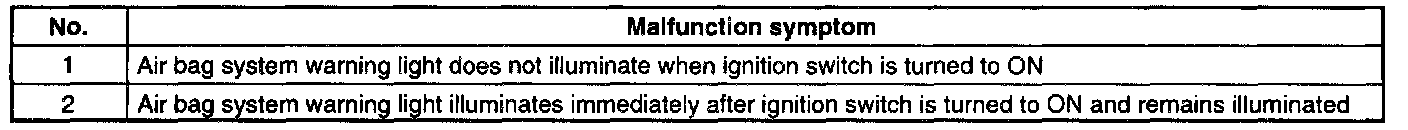 1. Airbag System warning light does not illuminate when ignition switch is turned ON