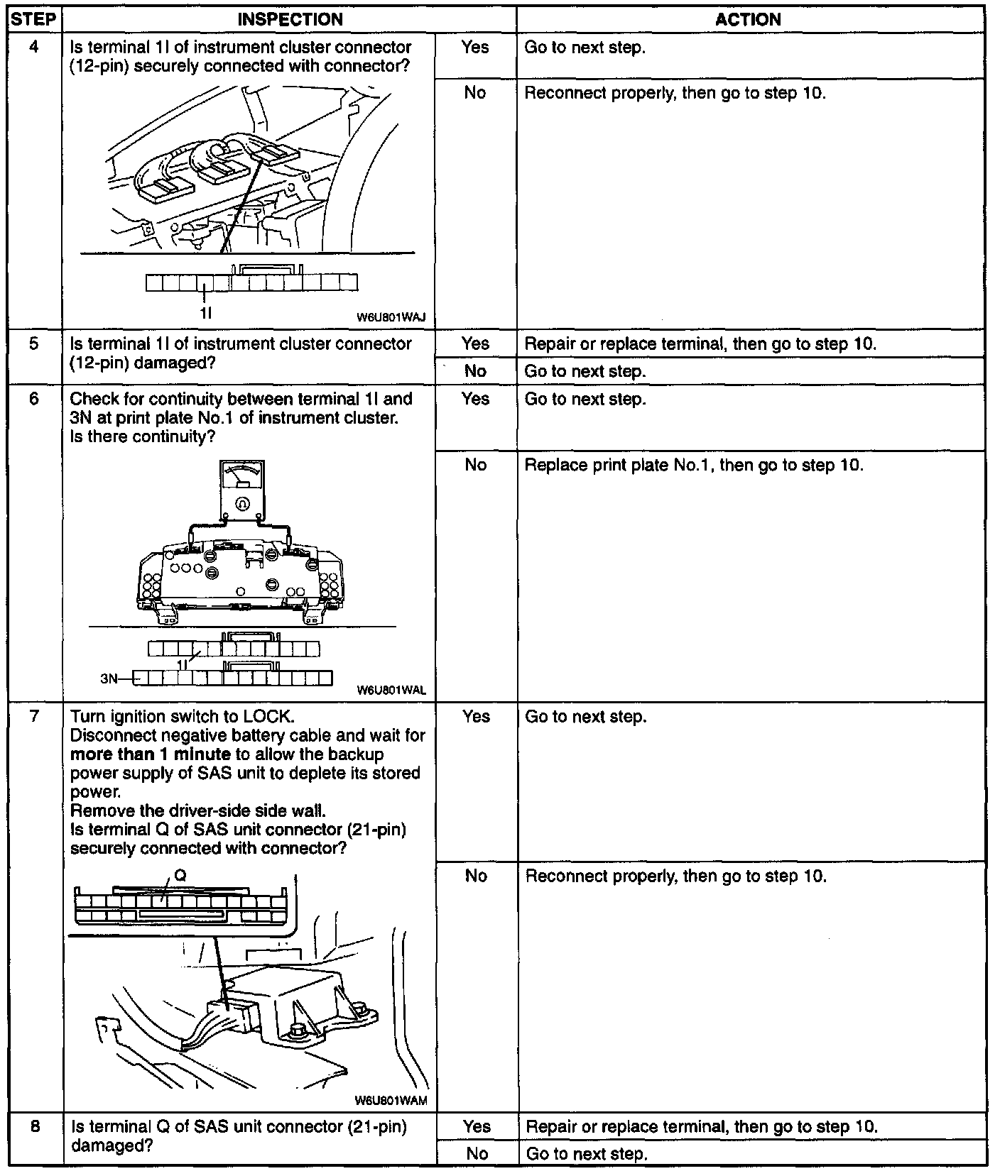 1. Poor contact at terminal B of short connector (4-pin) between instrument cluster and SAS unit