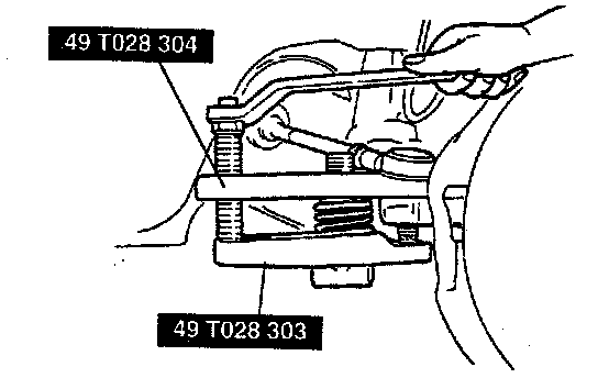 CAUTION: To prevent damage to the body, insert a rag into the gap between the fender and body, when installing the Special Service Tool (SST).