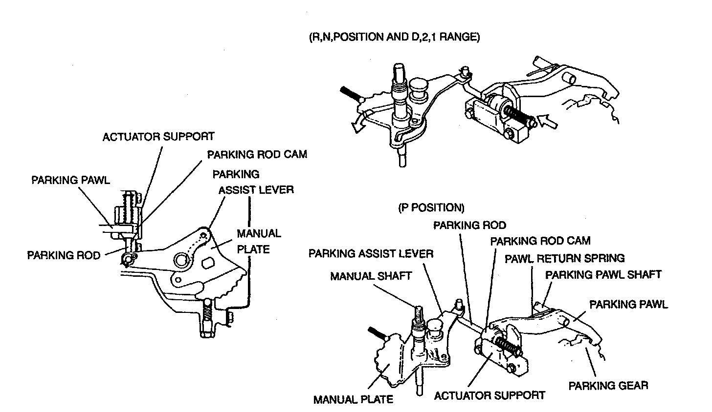 - The parking pawl engages the parking gear via the parking pawl shaft only in P position. It is held away from the, parking gear in all other positions and ranges by the return spring.