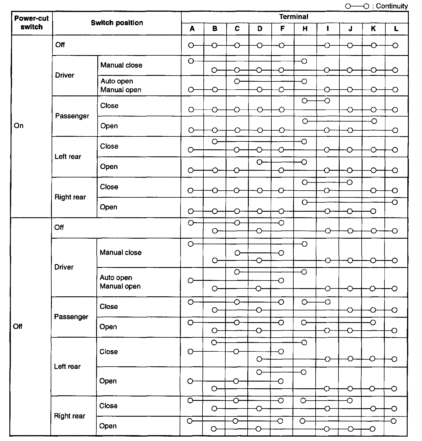 3. Inspect for the continuity between the power window main switch terminals by using an ohmmeter.