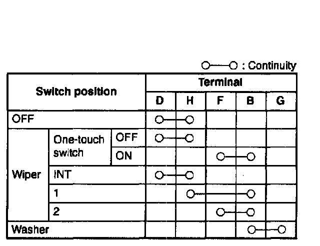 3. Inspect for continuity between the windshield wiper and washer switch terminals by using an ohmmeter.