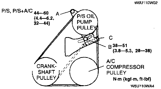 Adjust the belt deflection or tension by turning the adjusting bolt C.
