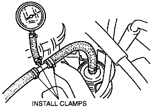 2. Install a fuel pressure gauge between the fuel filter and the main fuel hose. (Install clamps as shown.)