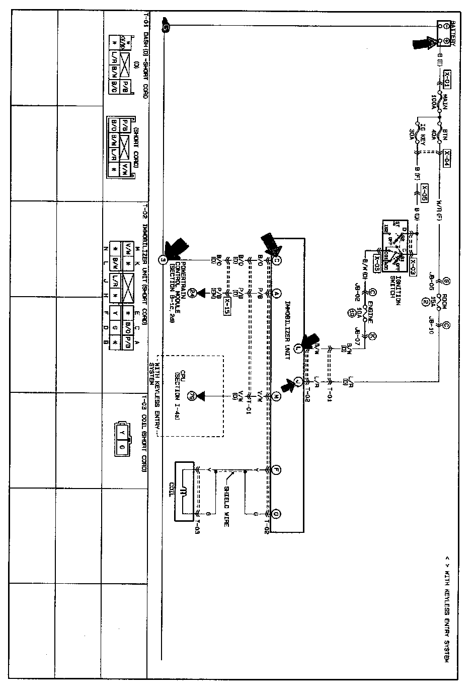 2. Connect a jumper wire between the positive battery terminal and terminal J (power supply) or (L back-up power supply) of the immobilizer unit. Refer to the arrows in the illustration