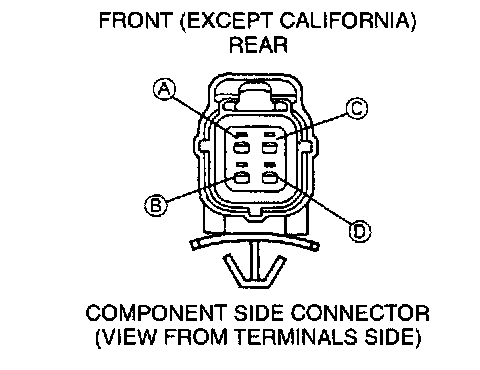 1. Disconnect the heated oxygen sensor connector.2. Measure the resistance between heated oxygen sensor terminals C and D for 4-pin connector or B and C for 3-pin connector by using an ohmmeter.