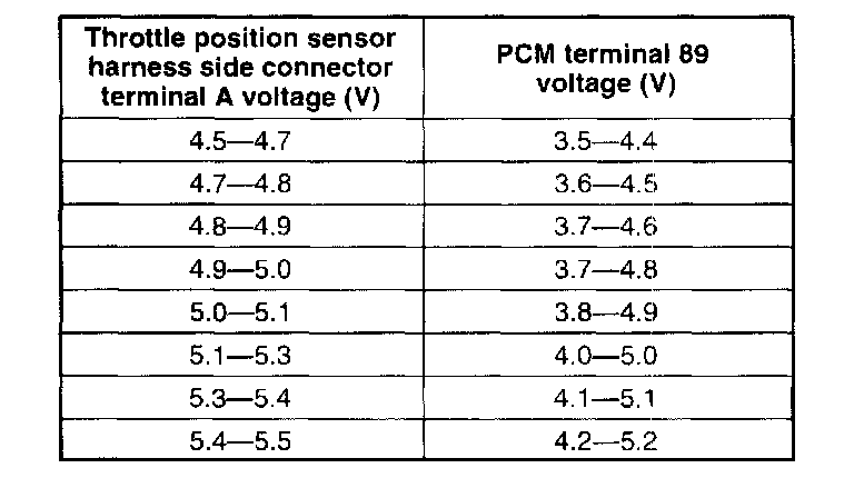 (8) When the throttle valve is at the wide open throttle, verify that the PCM terminal 89 voltage is in the specification.