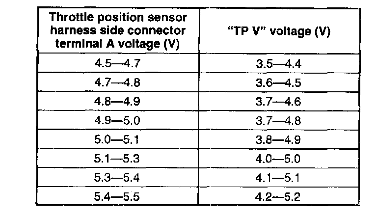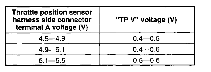 (7) When the throttle valve is at the wide open throttle, verify that the "TP V" voltage is in the specification.