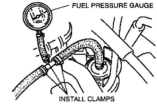 3. Connect a fuel pressure gauge between the fuel filter and the fuel distributor (Install clamps as shown).