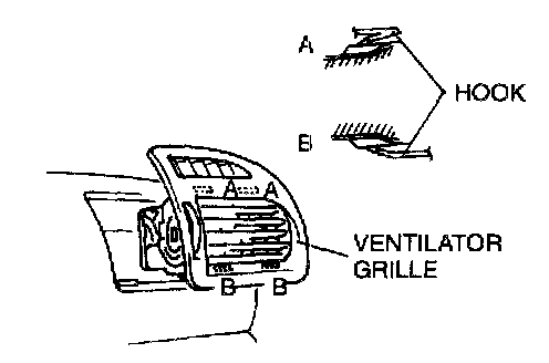 2. Push up hooks A and B from the backside of the dashboard to remove the ventilator grille.