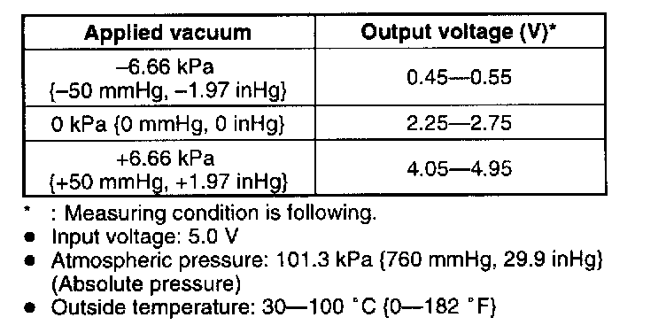 6. Decrease the applied pressure from +6.66 kPa (+50 mmHg, +1.97 inHg) to -6.66 kPa (-50 mmHg, -1.97 inHg) and verify that the PCM terminal 62 voltage decreases accordingly as specified.
