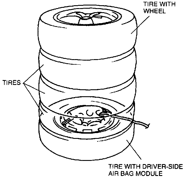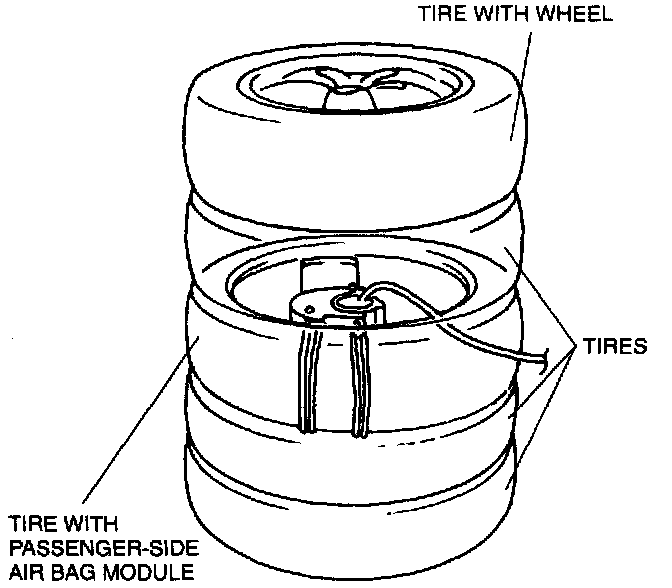 5. Stack the tire with the passenger-side air bag module on top of two tires. Stack a tire with a wheel on top of the three tires.