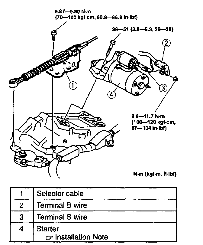 WARNING: When the battery cable are connected, touching the vehicle body with starter terminal B will generate sparks. This can cause personal injury, fire, and damage to the electrical components. Always disconnect the battery before performing the following operation.1. Remove the battery.