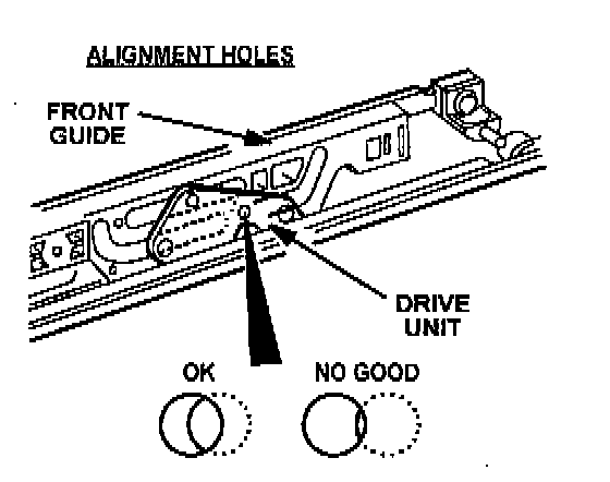 A. Cycle the sunroof once (tilt position down, slide open, then slide completely closed).B. Verify that the alignment holes in the drive unit and guide are aligned, and the sunroof motor pointers are lined up. Refer to illustration.