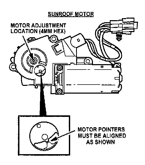 2. Remove the sunroof motor and align the motor (per the Workshop Manual (section 09, Sunroof Motor Removal). A 4 mm hex wrench can be used to line up the pointers if they are slightly mis-aligned.