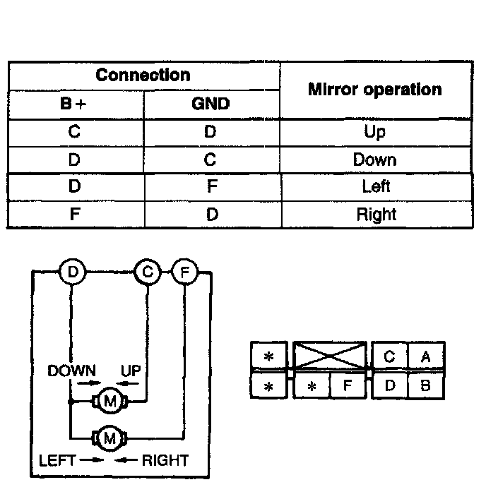 1. Remove the power outside mirror.2. Apply battery voltage and inspect the operation of the power outside mirror.