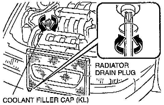 1. Remove the coolant filler cap on 2.5 (KL) and radiator cap on 2.3 (KJ) and loosen the radiator drain plug.