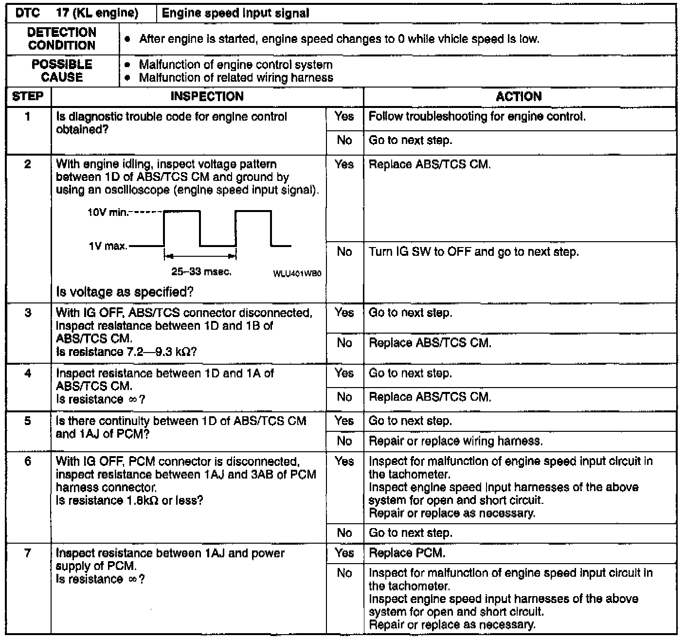 - Code 17 may be memorized if the engine is stalled or the ignition switch is turned to OFF while the vehicle is driving at 10 km/h (6.2 mph) or more.