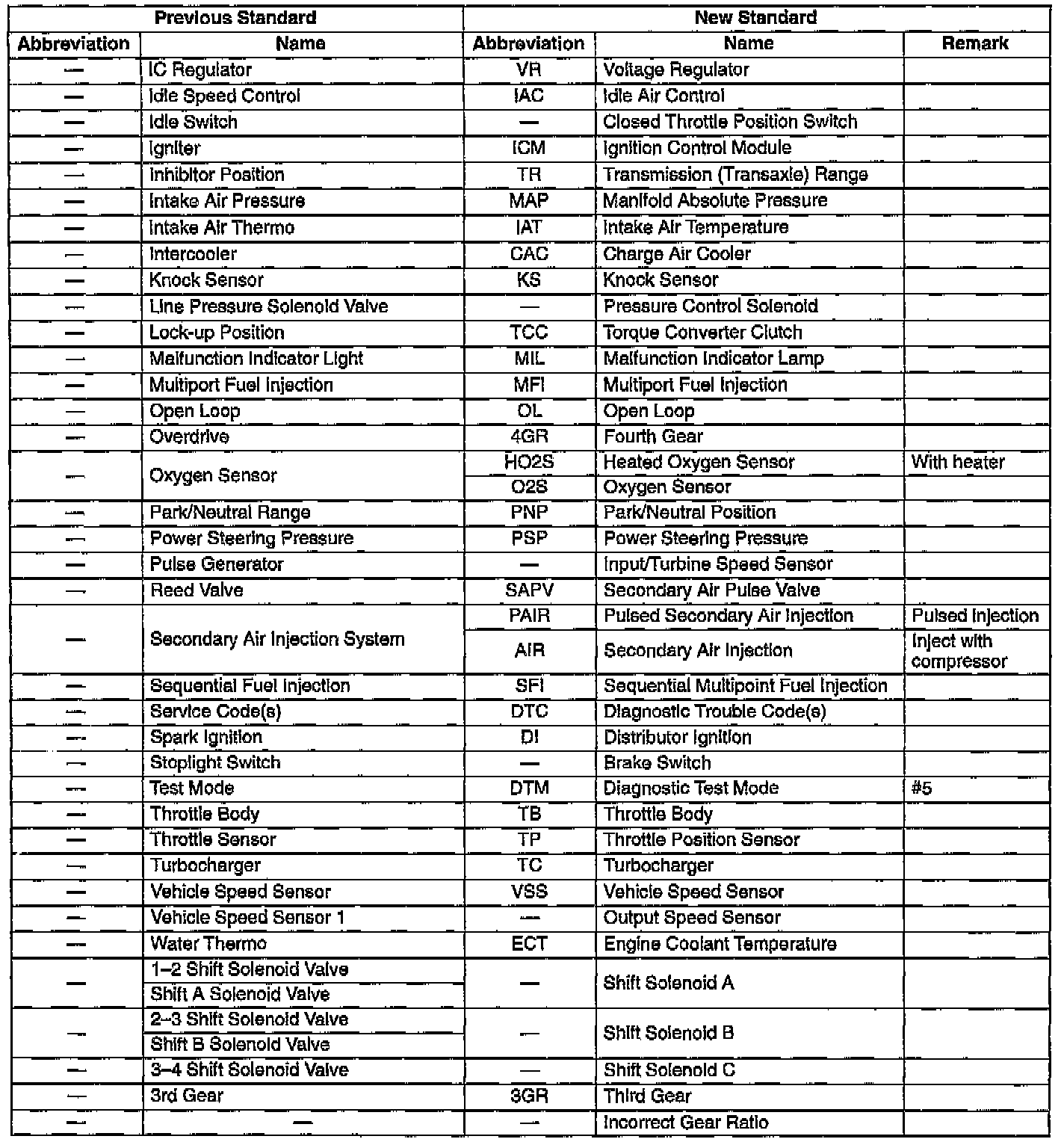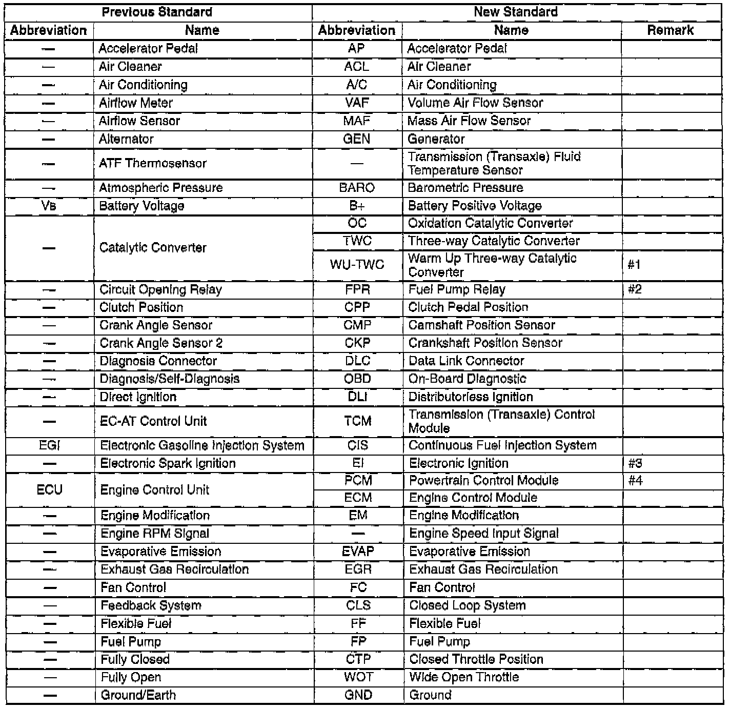 In accordance with new regulations, Society of Automotive Engineers (SAE) standard names and abbreviations are used throughout this vehicle's diagnostic information. The table below lists the names and abbreviations that have been used by the vehicle manufacturer up to now and their SAE equivalents.