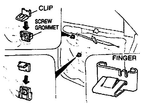 2. Point the finger of the upper clip upward and the finger of the lower clip downward and slide the clips onto the grommets. If the clips are installed upside-down, the door trim cannot be installed properly and the clips will be impossible to remove from the trim without breakage.