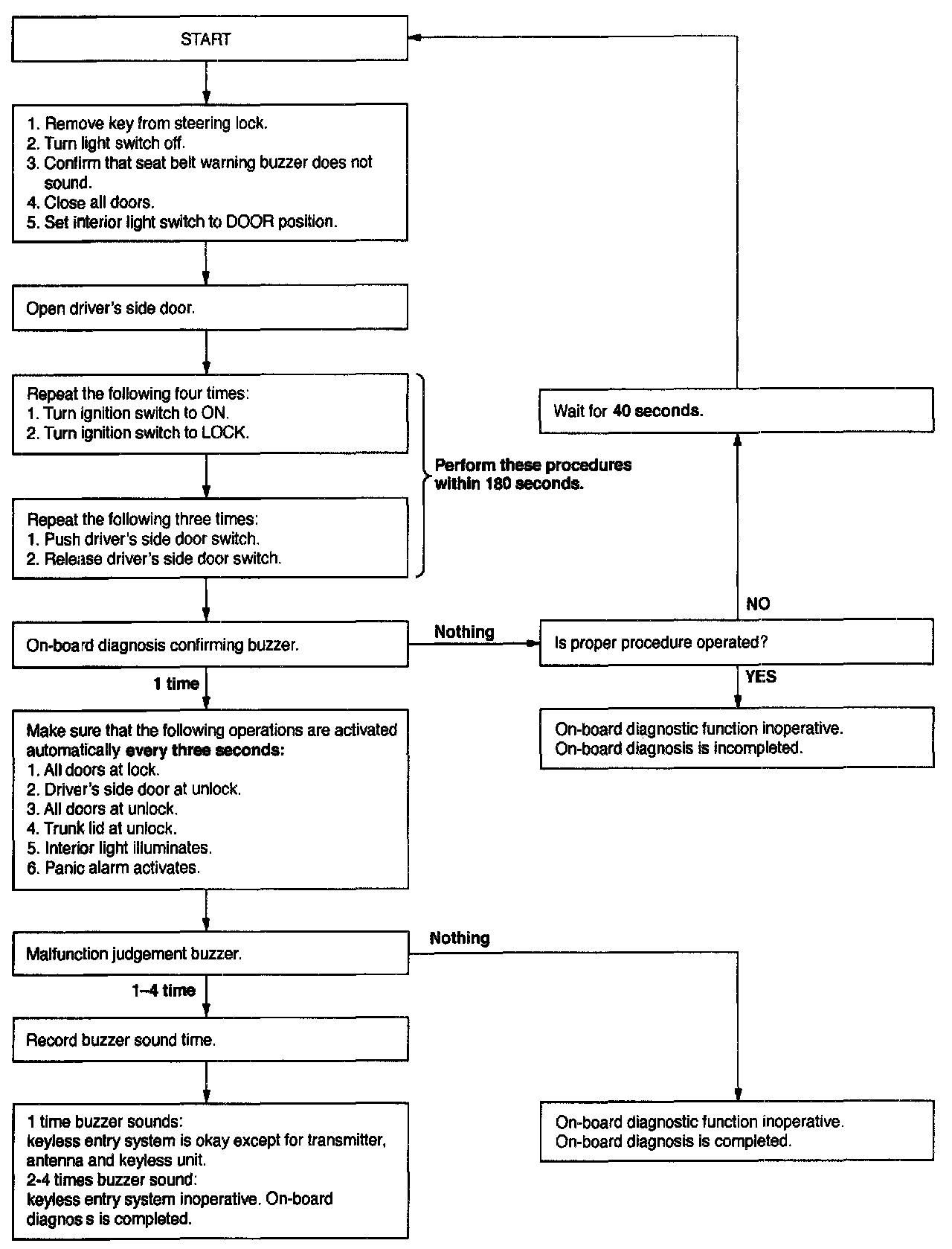 NOTE: If the buzzer sounds once, the keyless unit's digital circuit (keyless unit-CPU-door lock actuator) is operating normally. If the transmitter still does not operate when the digital circuit is normal, the trouble is in the high-frequency circuit (transmitter-antenna-keyless unit).