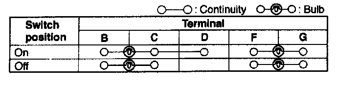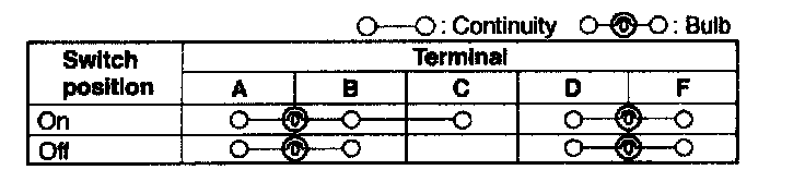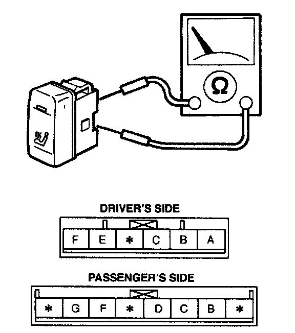 1. Remove the seat warmer switch2. Inspect continuity between the seat warmer switch terminals by using an ohmmeter.