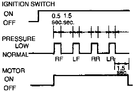 9. With the brake pedal still depressed, turn the ignition switch to ON and verify that the brake is released momentarily (approx. 0.5 sec.) and that the wheel turns when pressure-reduction operates.