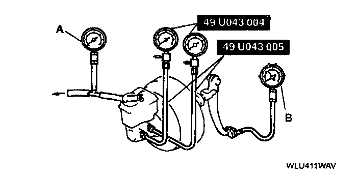 Connect the SSTs or equivalent, vacuum gauge (A), and pedal depression force gauge (B) as shown. Bleed the air from the SST gauges before performing the following tests.