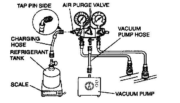 1. Install the manifold gauge set.2. Connect the tap pin side of the charging hose to the air purge valve of the manifold gauge.