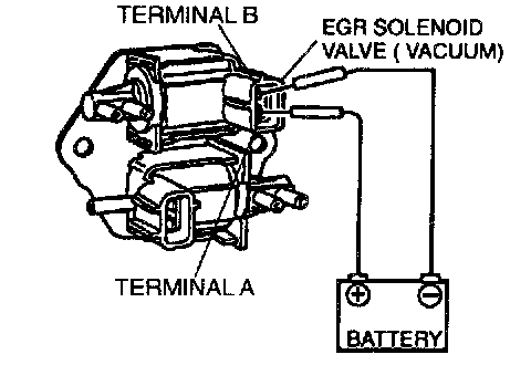 2. Apply battery positive voltage to terminal A and ground terminal B of the EGR solenoid valve (vacuum). Verify that air flows as shown below.
