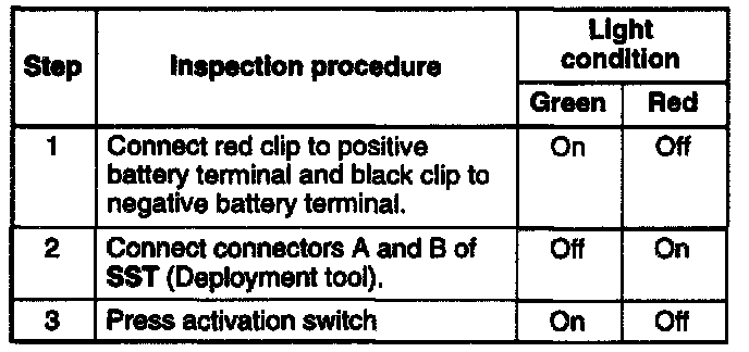 ^ Before connecting the SST (Deployment tool) to the clock spring, driver-side air bag module, or passenger-side air bag module, inspect the operation of the SST (Deployment tool).