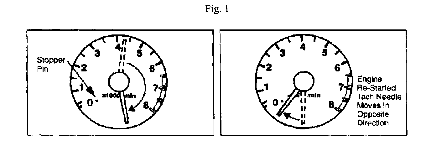 When the ignition is turned off at a high RPM (past mid-range), the force moving the tach needle clockwise becomes greater than the force returning it to zero. When restarting the engine, the tach needle moves to the wrong side of the stopper pin. Refer to the illustration above.