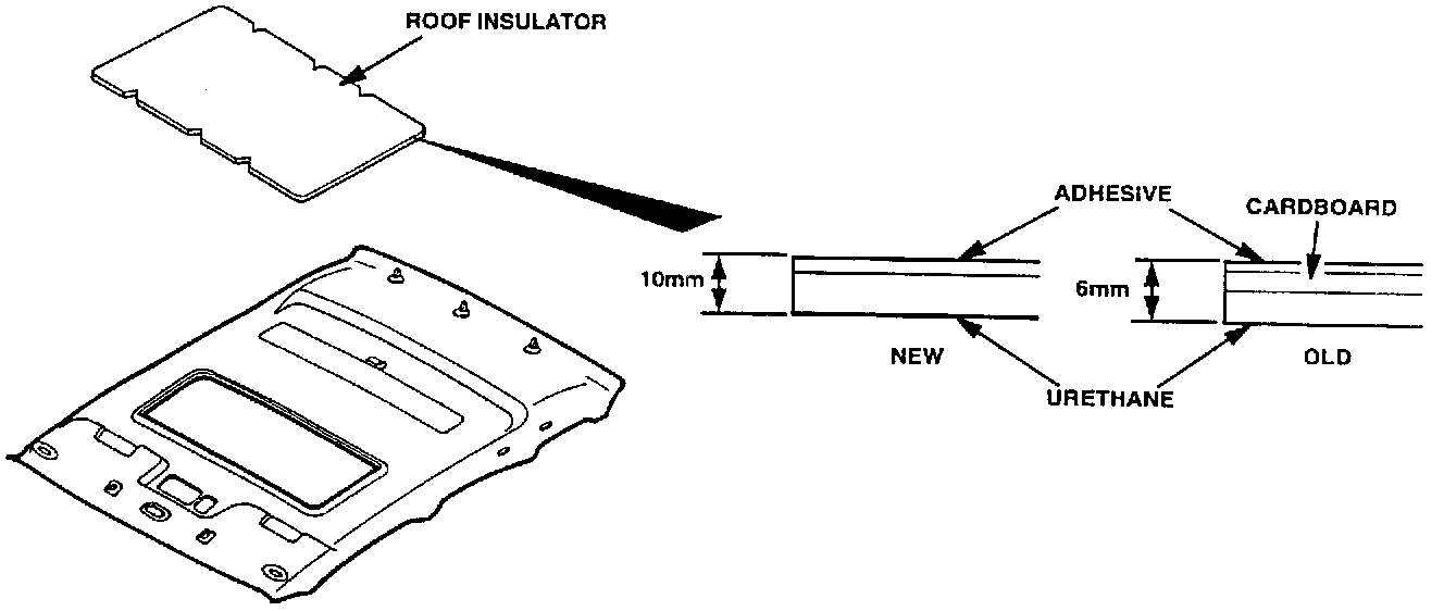 The root insulator on the top of the ceiling may peel away from the root panel. The condition may result in the insulator hanging down in some areas and restricting the operation of the sunshade or sunroof. To prevent this condition, the cardboard layer between the roof panel and the adhesive has been eliminated. To improve noise insulation and adhesive properties, the thickness of the roof insulator has been increased from 6mm to 10mm and adhesive changed (see illustration).