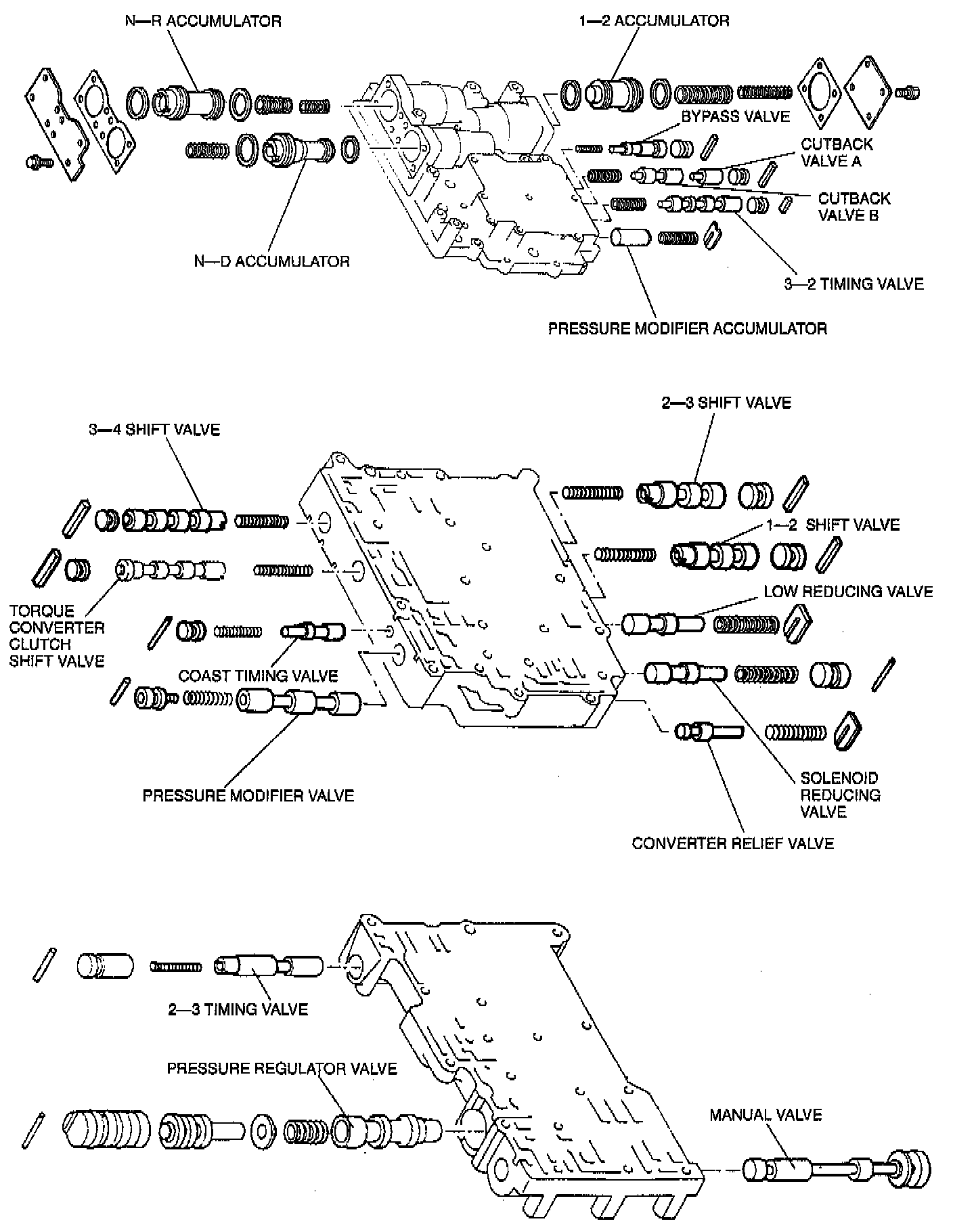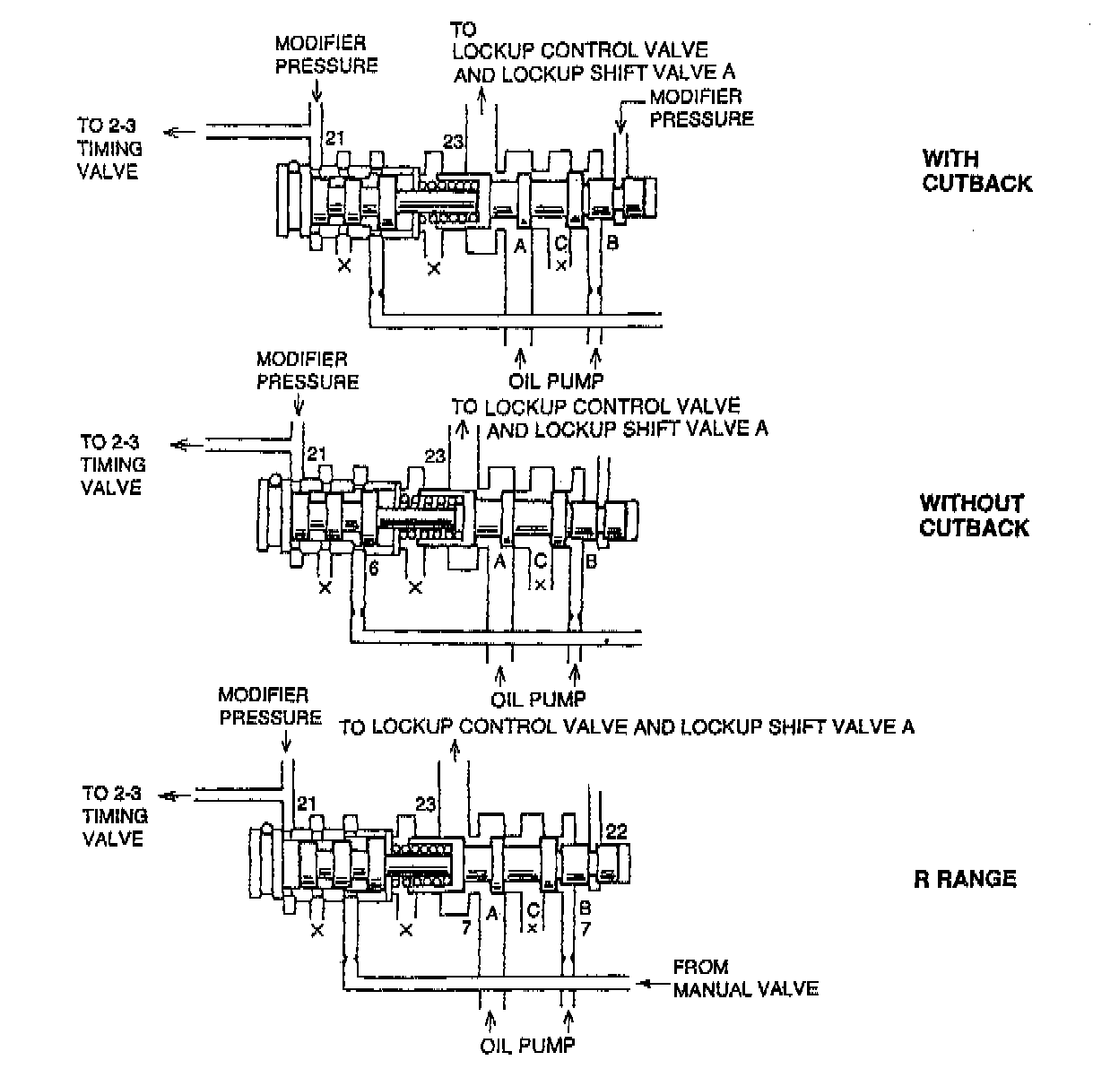 The modifier pressure (21) applied to the left end of the valve assures that 3-4 clutch application timing matches throttle valve opening angle.